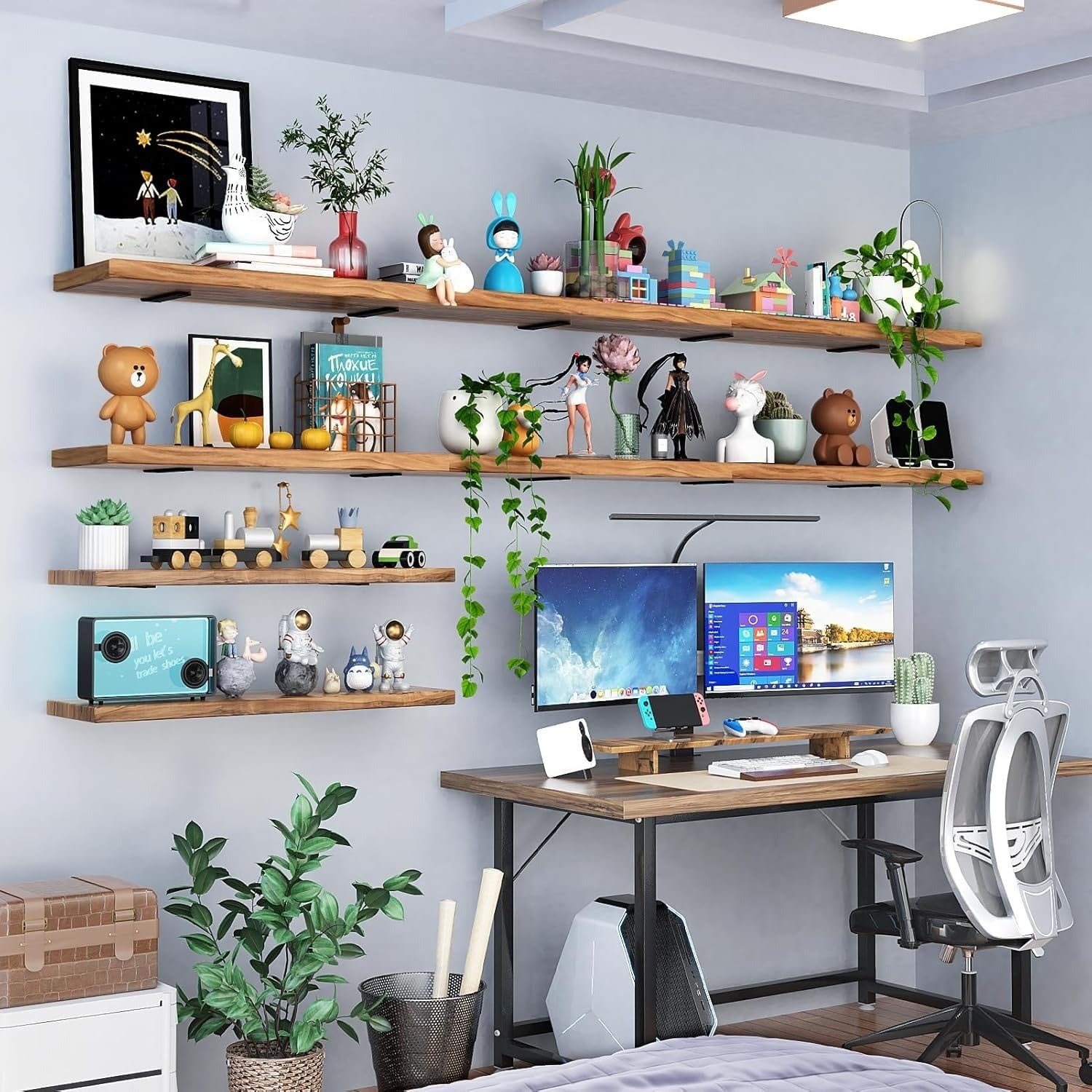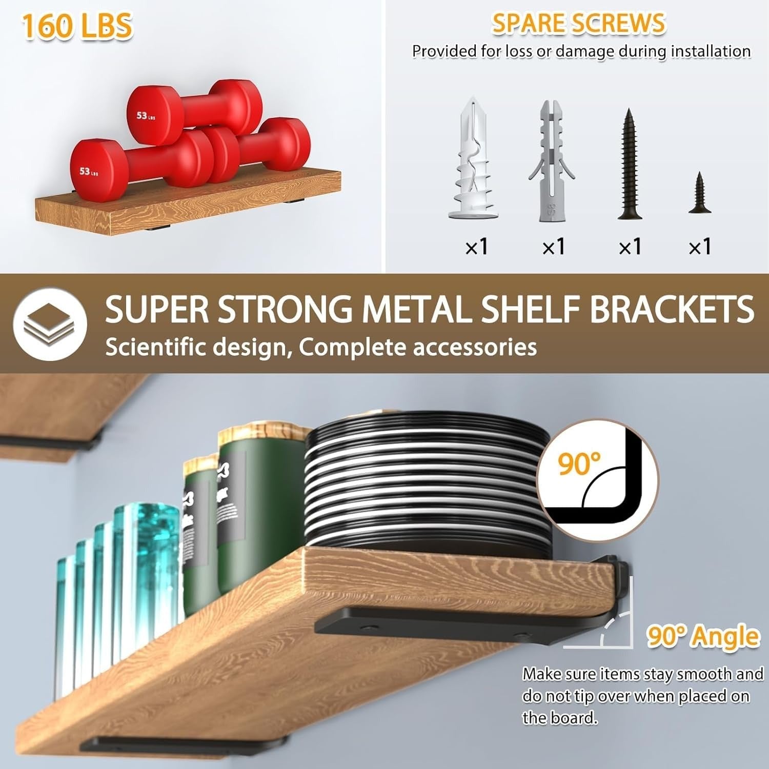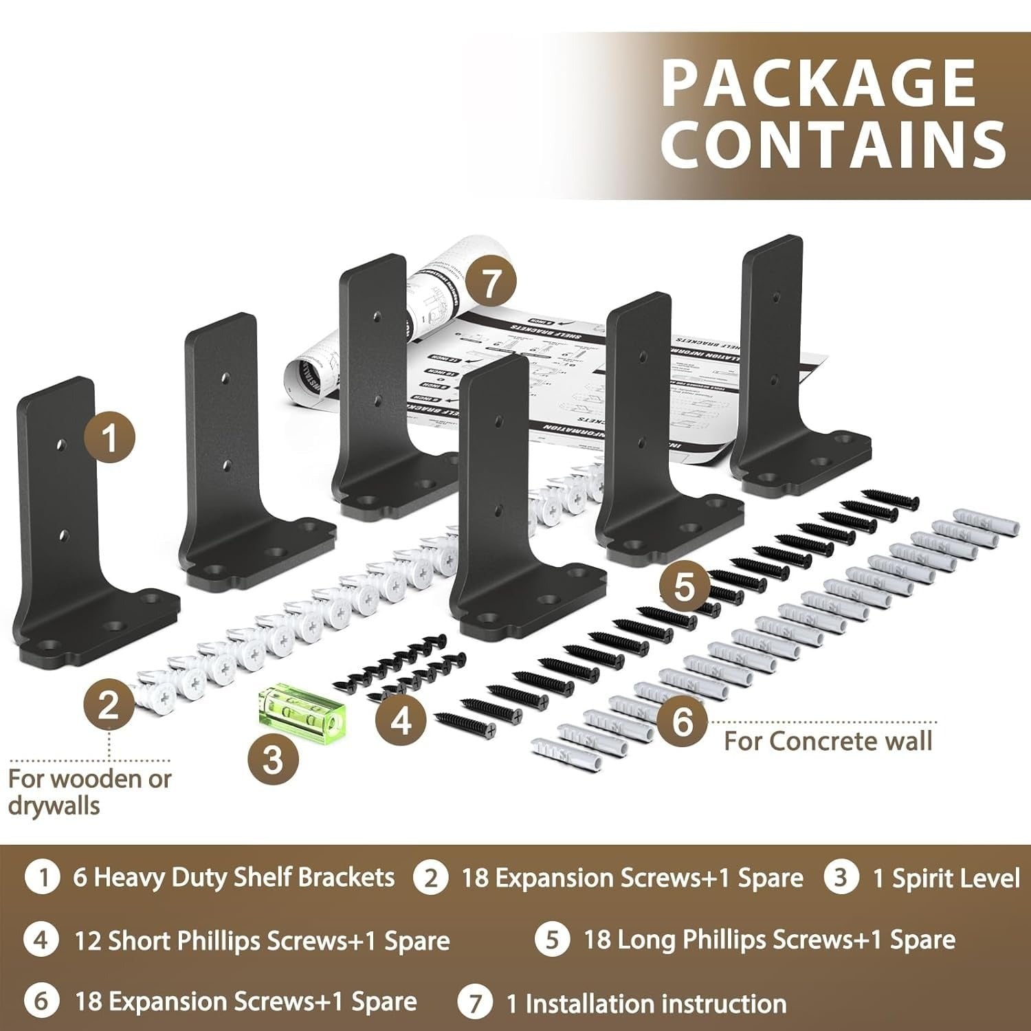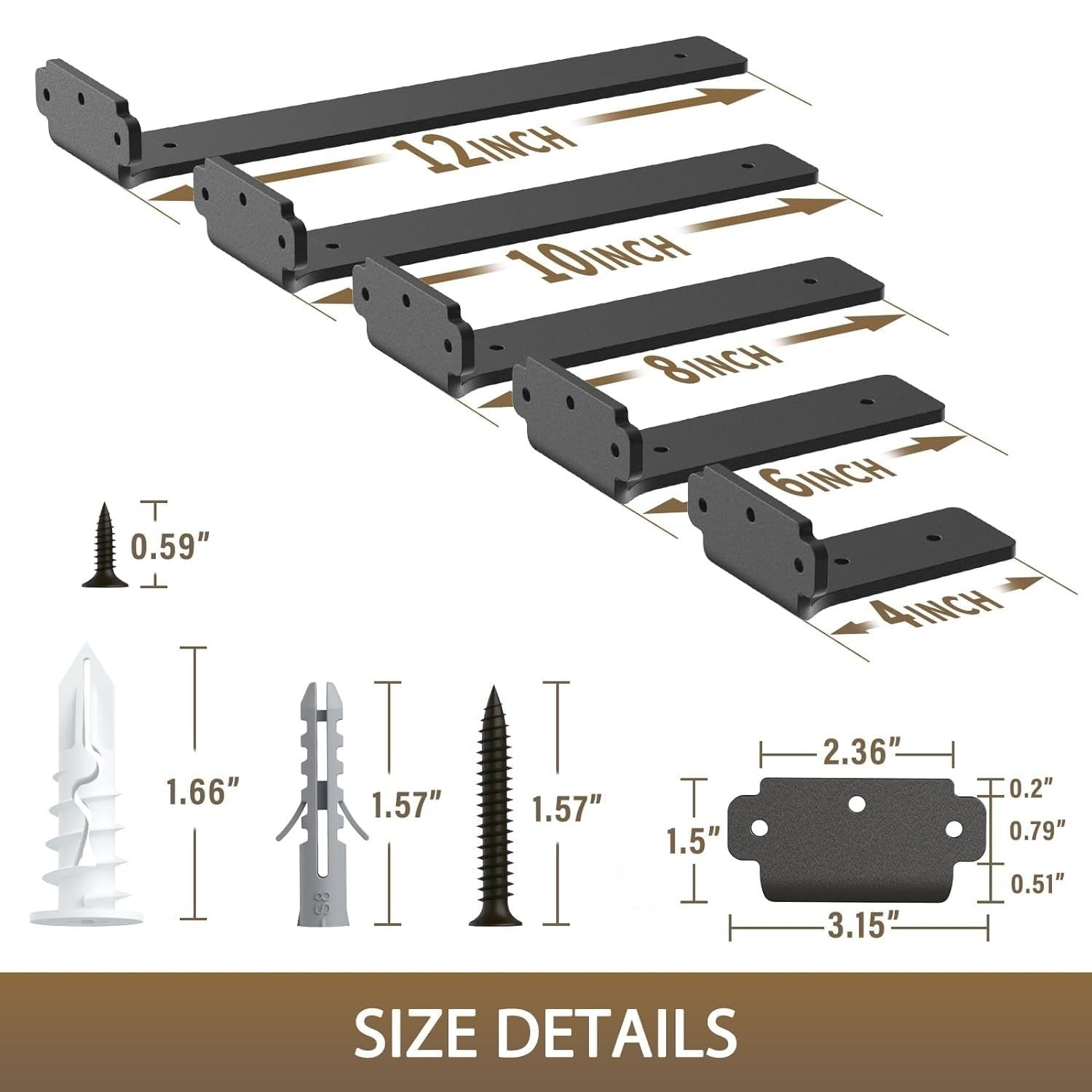 【Suitable For 2*4” Wood Studs】Goovilla hidden shelf brackets is desiged with a 1.57*1.38” backplane. The small size and 3 close together screw holes match the narrow 2×4 inch (actual size is 1.5*3.5” ) wood studs thoroughly. 【Standard 90° bending】In order to ensure that each shelf bracket can be at 90° to the maximum extent possible, we add a rigorous picking process before the shelf brackets are packaged. The standardized 90-degree design is so important that it’ s the objective factor in ensuring that items remain level and do not tip over after being placed on the board(board is not included). 【Heavy Duty Iron & Durable Coating】Our floating shelf hardware is made of 1/5” thick, heavy-duty iron, stamped and bent in one piece, no welds are not easy to break with better toughness. Each pair of heavy duty shelf brackets can hold up to 160 pounds of weight. The surface is covered with a thick layer of black frosted coating. It increases the friction between the board and the bracket, on the other hand, it is more waterproof and less prone to rust, which prolongs its service life. 【Complete Accessories & Easy to Install】Boards is no included. Provide all the screws needed for different wall mountings, and extra spare screws for unexpected situation. They can achieve strong grip on wall surface. And a spirit level is also included to measure as well as keep the brackets for wood shelves balanced during installation. Detailed installation instructions are provided. Just follow the steps, this wall mount shelf bracket can be installed even by someone without experience. 【For Wood & Plaster & Concrete Wall】No need to worry about you can’t use our black shelf bracket on the wall you want to. These metal shelf brackets can be used on wooden wall, drywall and hard concrete wall. The screws used for wooden wall and plaster walls are the same and are explained in detail in the instructions. 【Unrestricted Space Usage】We provided 4 in, 6in, 8in, 10inch and 12inch wall shelf brackets. Pick the right bracket or use it in combination depending on the actual space or the size of the planks. Our wall brackets for shelves is not limited to kitchen use only, is also for living rooms, bedrooms, bathrooms, storage rooms, utility rooms, checkrooms, laundry room and corners to store green plants, photo frames, handwork, books, toiletries, storage baskets, sundries or to be a cat climbing frame.