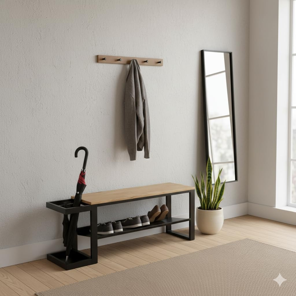 Transform your entryway with this sophisticated JP IRONS Industrial Shoe Storage Bench. Featuring a sleek black metal frame and warm wooden top, this versatile piece combines style with practical organisation. The bench measures 95 cm in length, 40 cm in height, and 30 cm in depth, making it perfect for compact spaces. The thoughtfully designed structure includes a comfortable seating area, a spacious lower shelf for shoe storage, and a convenient side stand for umbrellas or walking sticks. The robust metal framework ensures stability, while the wooden seat adds a touch of natural warmth to your space. This multifunctional bench is ideal for hallways, mudrooms, or any area where you need organised storage with a place to sit. The minimalist industrial design complements various interior styles, from modern to rustic. Keep your entryway tidy and welcoming with this practical storage solution that helps maintain order in busy households.