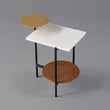 Modern 3-Tier End Table, White Marble Top, Gold Metal Disc, Walnut Wood Shelf, Black Frame