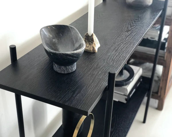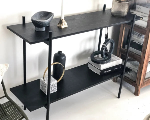 - VERSATILE DESIGN: Two-tier console table featuring a sleek black metal frame and wooden shelves, perfect for modern and Scandinavian-inspired interiors