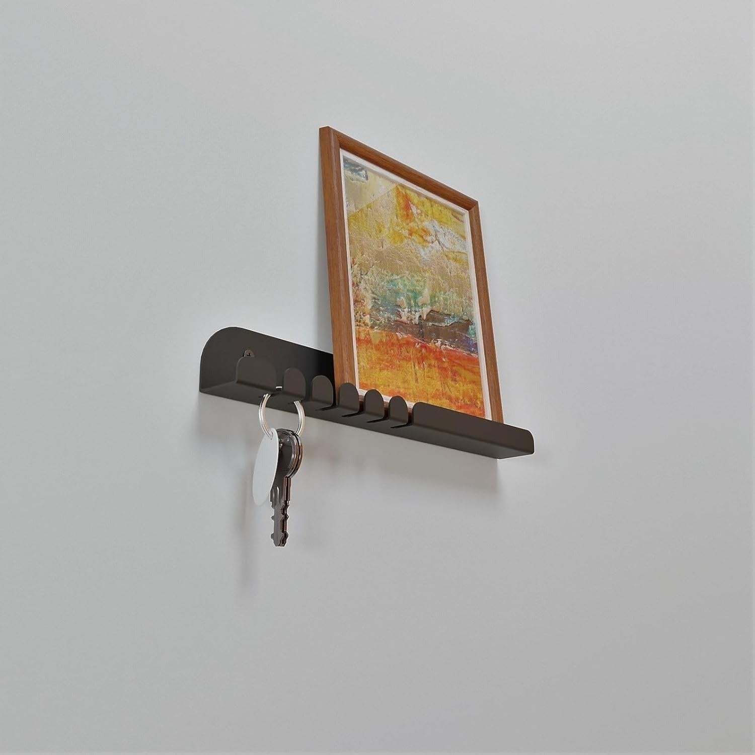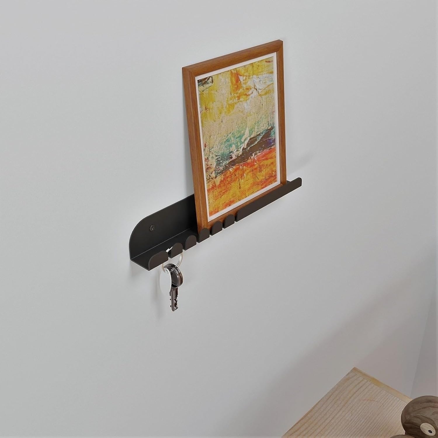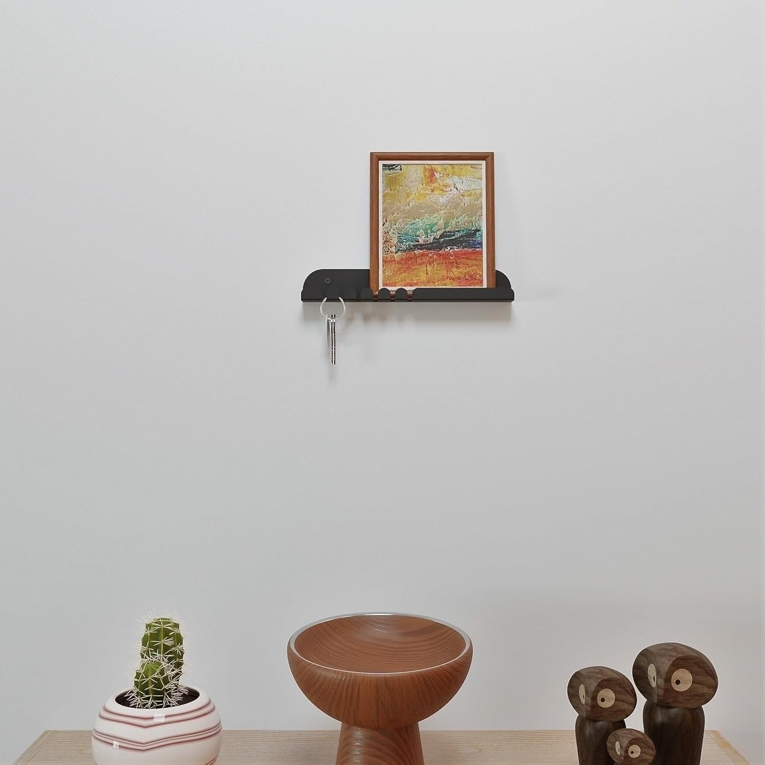 Modern Entryway Wall Shelf with Key Hooks, Metal Mail and Key Organiser, 25 cm Width, Black
