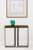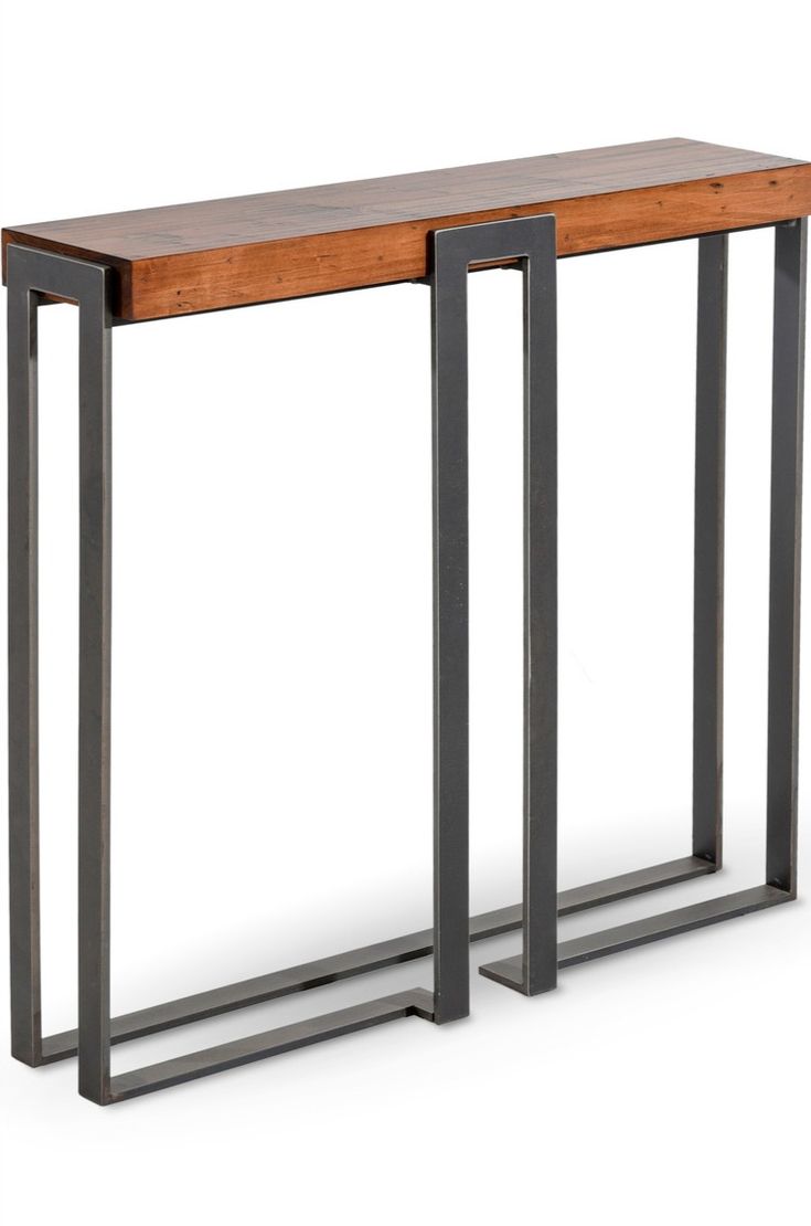 - Sleek, minimalist console table with a sturdy metal frame and rich wood top, ideal for entryways or living rooms.