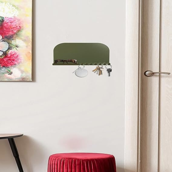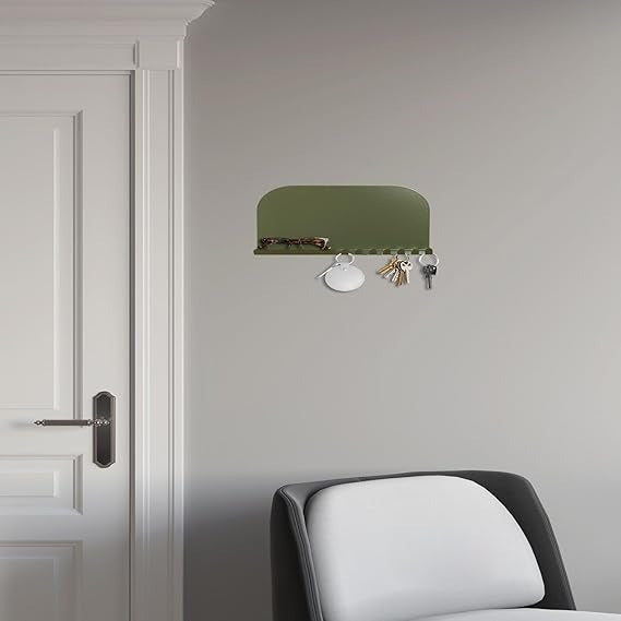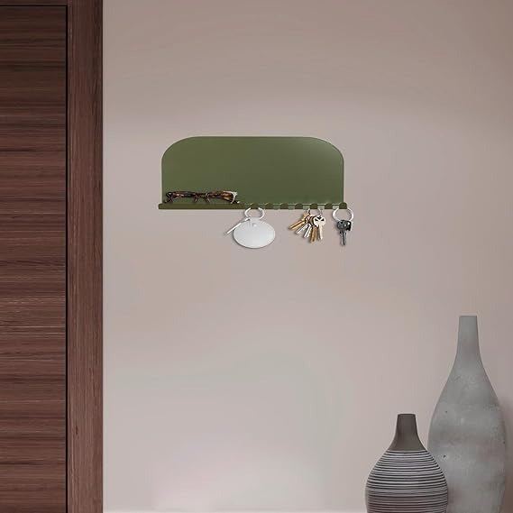 Modern Metal Wall Shelf with Key Hooks, 23 x 15 x 5 cm, Green, Floating Storage Organizer