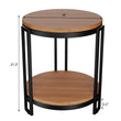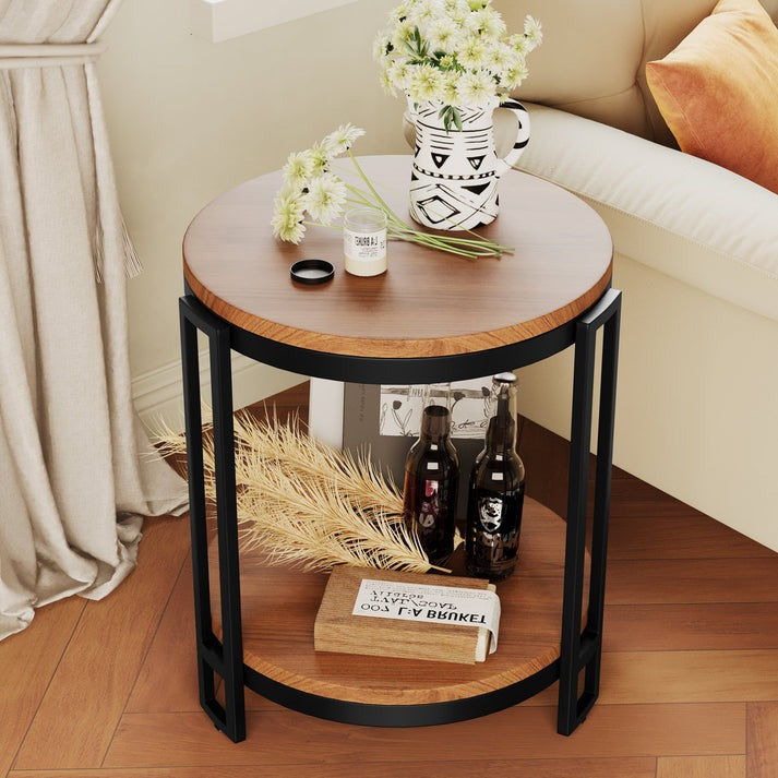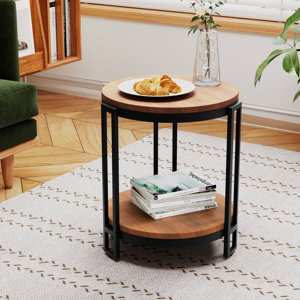 Modern Round Side Table, 2-Tier, Walnut Wood with Black Metal Frame, 45.7 cm