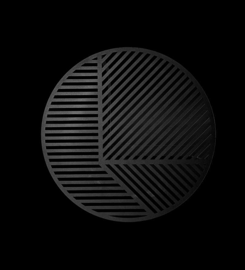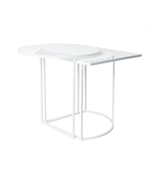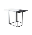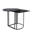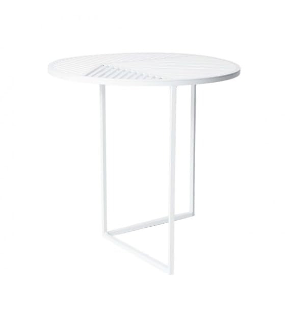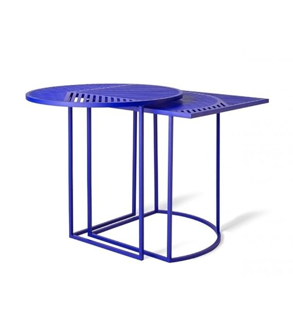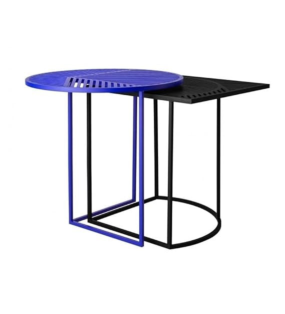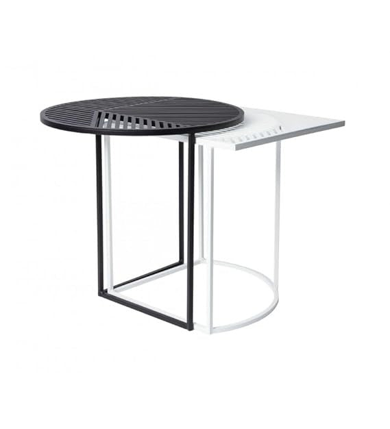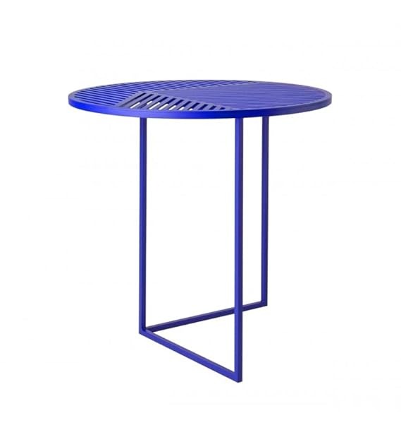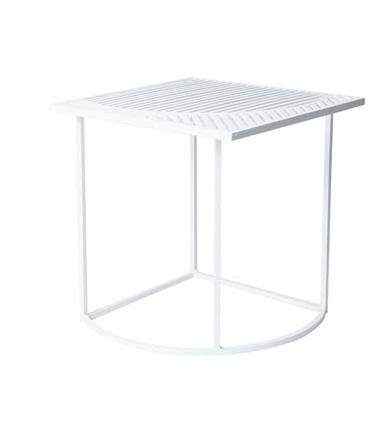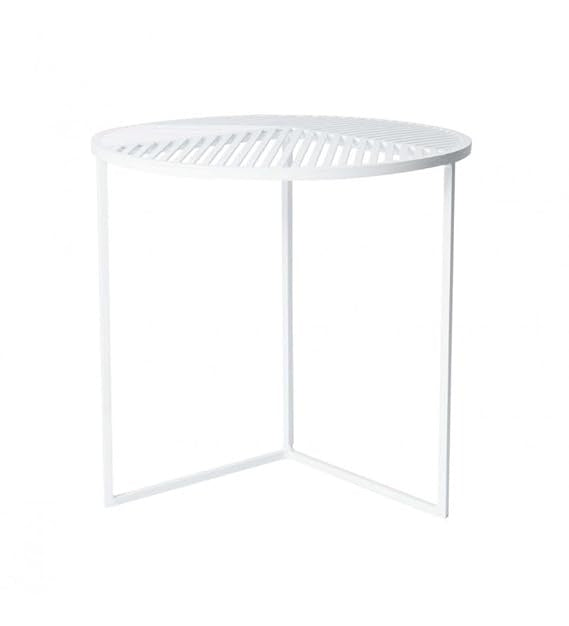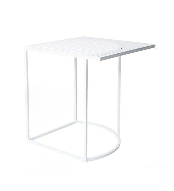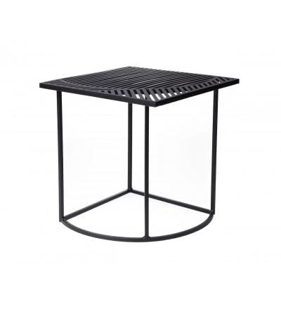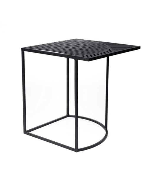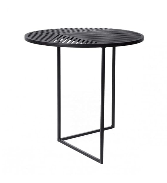 - DESIGN: Modern steel side table with sleek geometric base and slatted round top, featuring a contemporary minimalist aesthetic