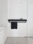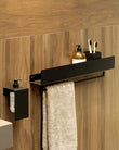 - MODERN DESIGN: Sleek wall-mounted bathroom shelf in matte black finish with integrated towel bar, perfect for contemporary minimalist spaces