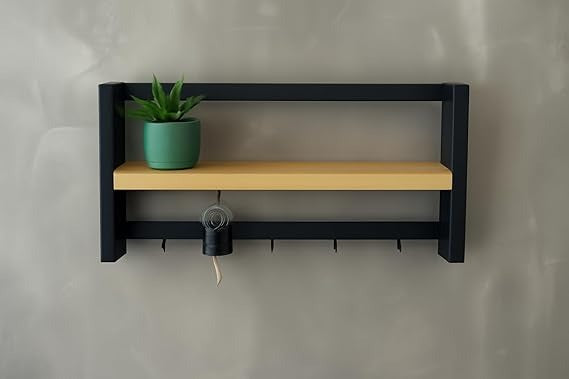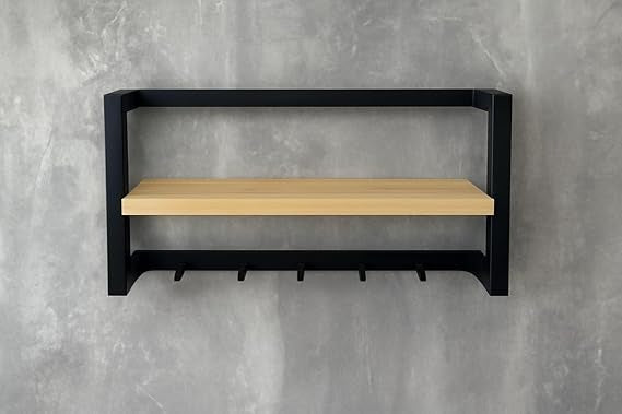 Modern Wall-Mounted Shelf with Hooks, Black Metal Frame, Natural Wood, Entryway Organiser