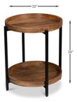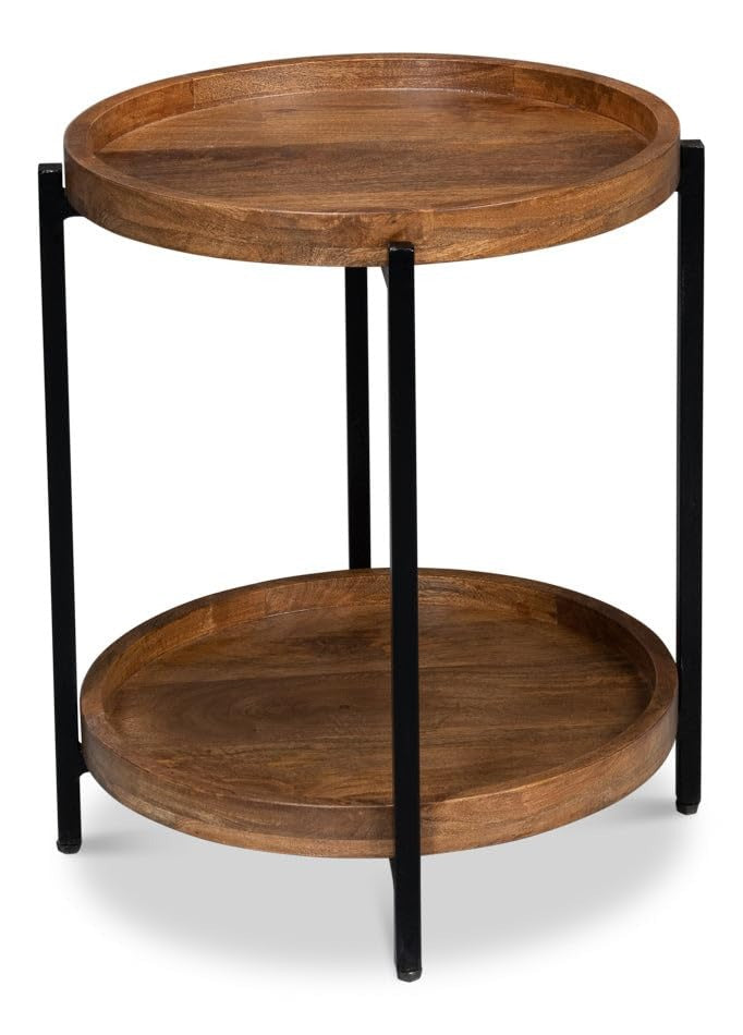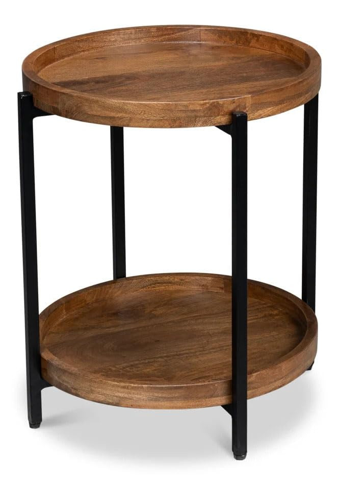 - CONSTRUCTION: Features a sturdy black iron frame supporting two round mango wood tiers, combining industrial style with natural warmth